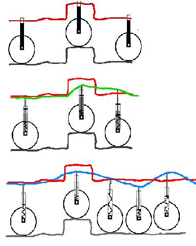 Ohne alles... Mit gedämpfter Federung, grüne Linie: Der Schwerpunkt wir verzögert und lange nicht so hoch angehoben, es wir dazu logischerweise auch weniger zusätzliche Kraft benötigt. hinter dem Hindernis dauert es etwas, bis die ursprüngliche Schwerpunkthöhe wieder erreicht ist.
