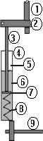 Aufbau der Federgabel: 1 Gabelschaft 2 Gabelbrücke 3 Tauchrohr 4 Standrohr 5 Luftkammer, federndes Element, alleine oder zusammen mit einer Feder (8), 6 Ölfüllung, zum dämpfen, im zusammenhang mit dem Ventil (7) 7 Ventil 8 Stahlfeder 9 Vorderradachse
